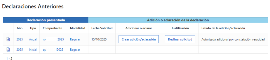 1. "Crear adición/aclaración" - Este botón permite añadir información de forma precisa y detallada. Se creará una nueva declaración bajo la modalidad "Adicional: constatación veracidad". Deberá completar los apartados solicitados en esta nueva declaración.