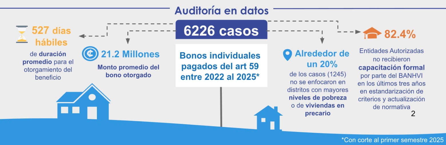 La CGR emitió un informe de auditoría al Banco Hipotecario de la Vivienda (BANHVI) respecto de la asignación transparente, por parte de esta entidad, de bonos individuales mediante artículo 59 del Sistema Financiero Nacional para la Vivienda (SFNV) con recursos del Fondo de Subsidios para la Vivienda (FOSUVI). La transparencia en la asignación de bonos de vivienda es esencial para garantizar que los fondos públicos se usen con eficiencia, legalidad y equidad, asegurando que el beneficio llegue a las familias más vulnerables.